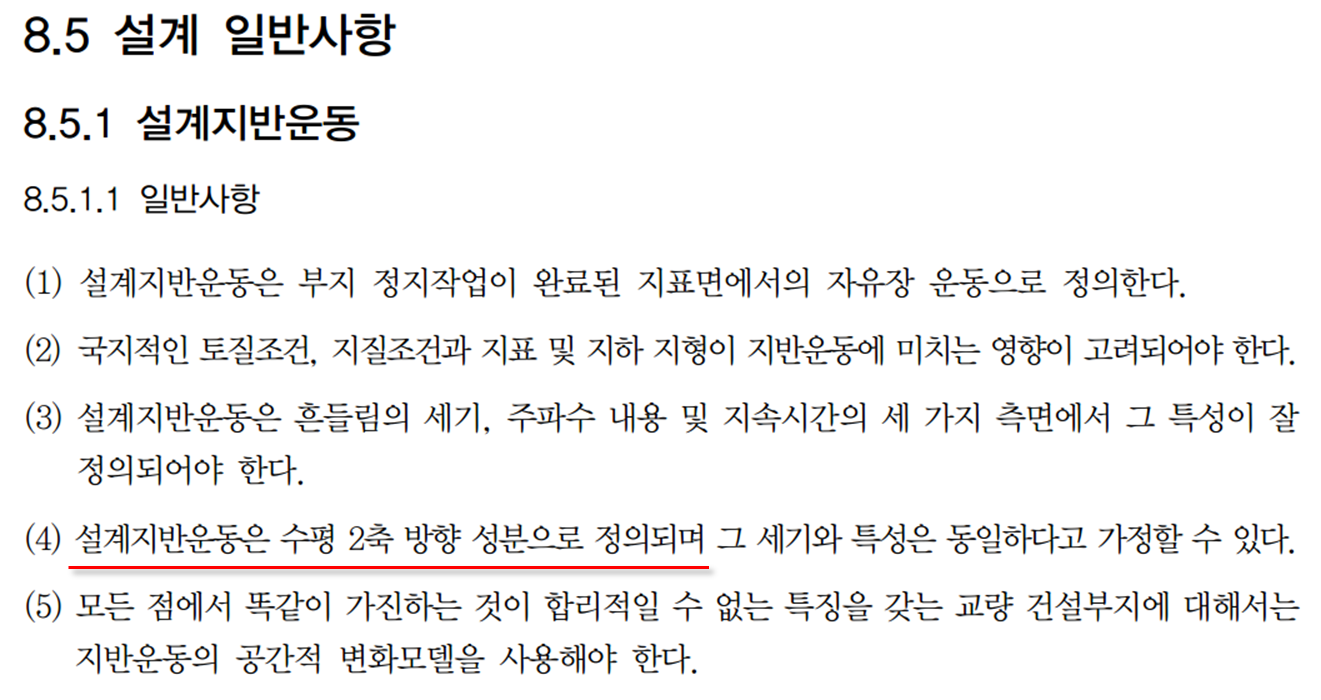 지진에 의한 지반운동 가속도는 교축방향, 교축직각방향 및 수직 방향으로 발생한다. 그러나, 시방서에서는 아래와 같이 수직 방향으로의 지진력을 고려하지 않도록 명시되어있다.
