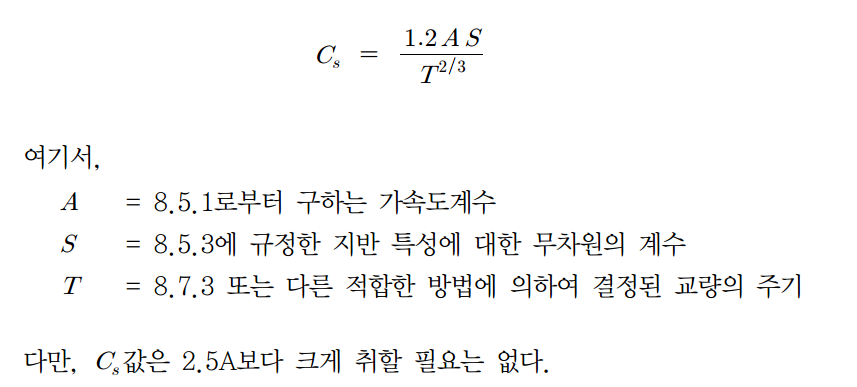 시방서에 정의되어있는 탄성지진응답계수는 아래와 같으며, 최대 2.5A 를 초과할 수 없다.