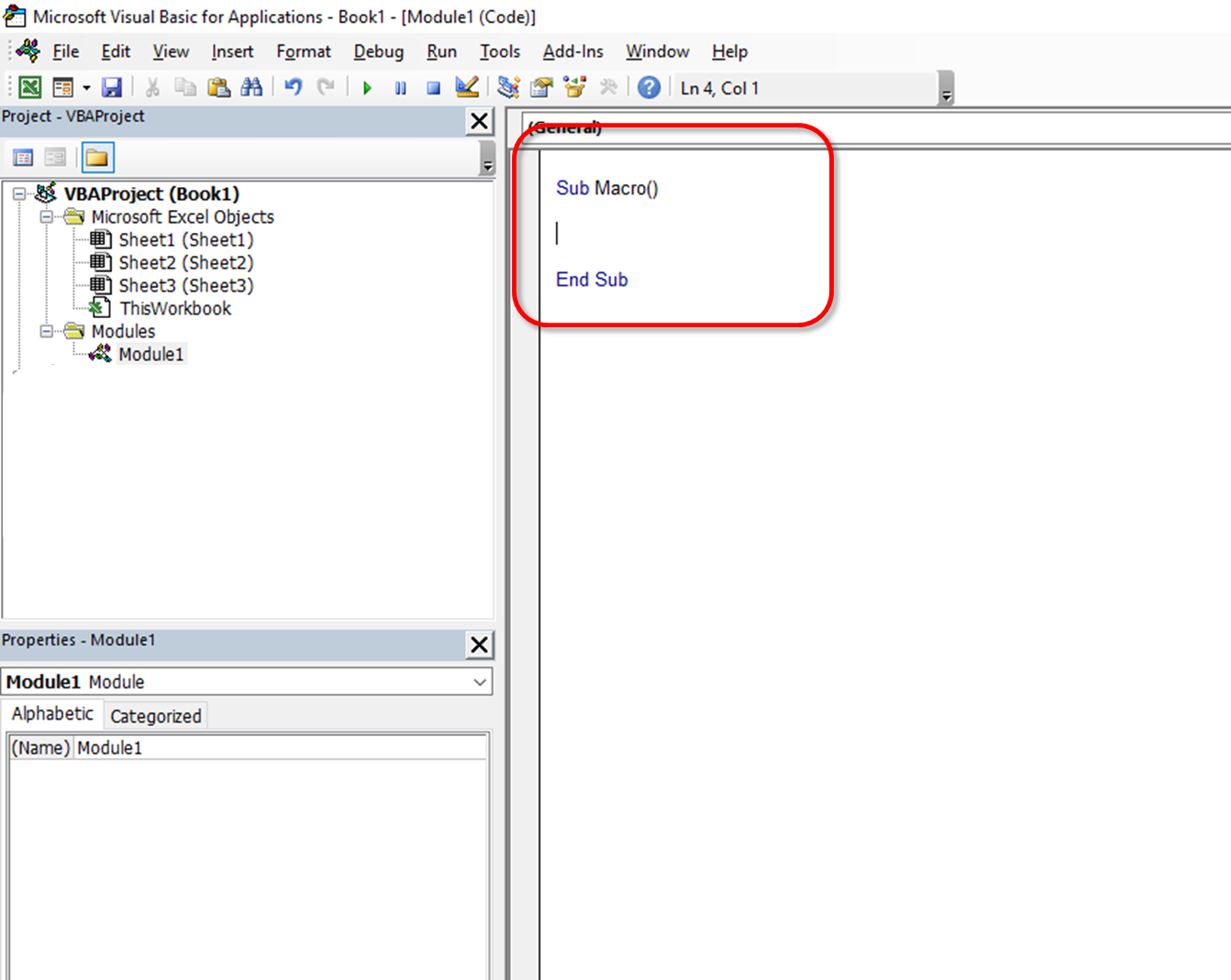 위에서 생성한 Macro Module내에 아래와 같이 Sub 함수를 지정하여 매크로를 생성한다.