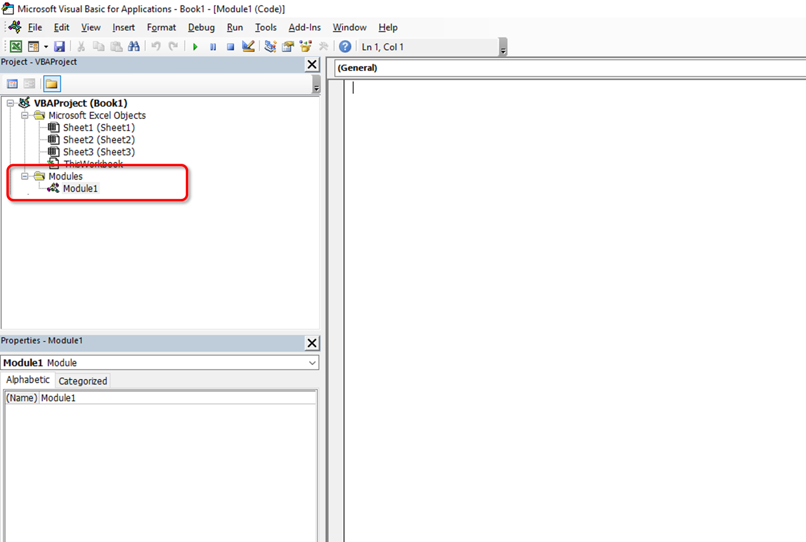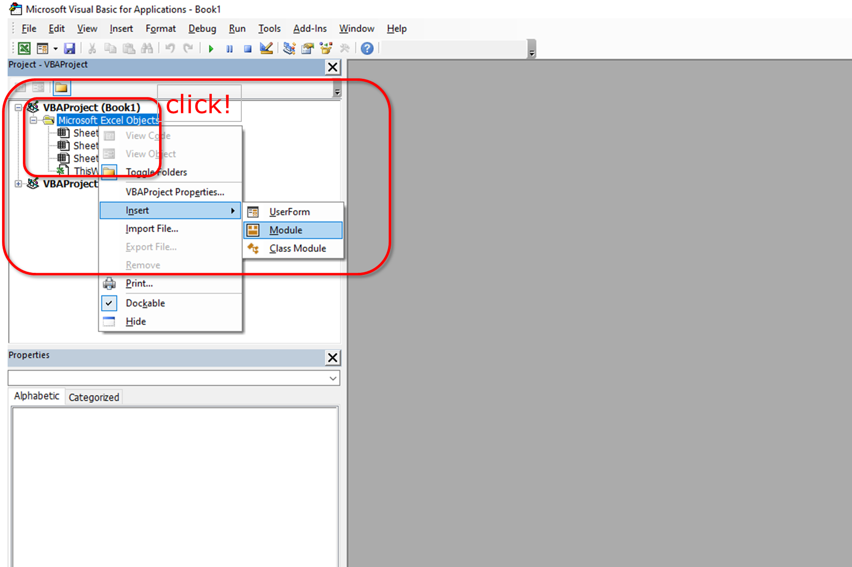 ♣ Mouse 커서를 왼쪽 상단에 두고, Mouse 오른쪽 버튼을 누르면 Drop down 메뉴에서 "Insert"≫"Module" 클릭