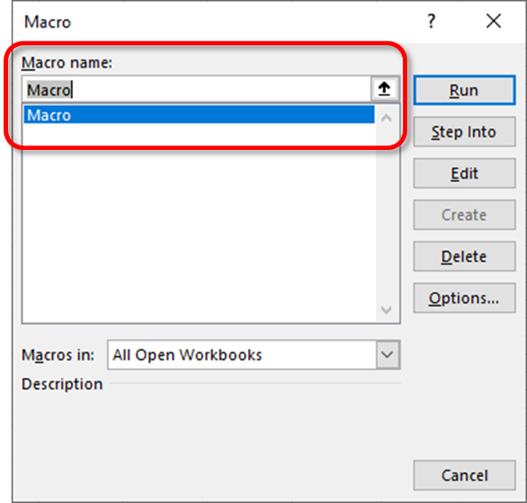 위와 같이 생성된 매크로는 엑셀에서 "Alt" + "F8" 키를 눌러보면 아래와 같이 Popup창이 뜨며, sub 함수의 이름이 표시된다. 이 매크로를 실행하면 sub 함수 내에 지정된 코드가 실행이 된다.