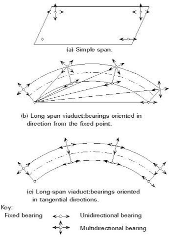 - 곡선교의 경우, 가동받침의 이동방향은 곡선반경에 접선으로 배치하거나, 고정받침의 방사상 현 방향으로 배치