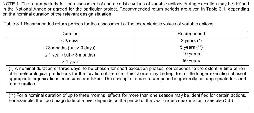 위 식에서 초과확률, p를 산정할려면, 공사기간에 해당하는 풍속의 재현주기를 산정해야 하는데, 아래와 같이 표3.1로 대략적인 재현기간을 산정할 수 있다. 따라서, 초과확률, p = 1 / R (재현주기) 로서 산정할 수 있겠다.