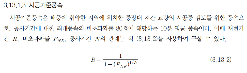 도로교 설계기준에 언급된 시공기준 풍속은 아래와 같이, "최대풍속"의 비초과확률 80%에 해당하는 풍속으로 정의되어있다. 다행히 도로교 설계기준 2015년 해설편에는 간단히 설계기준풍속의 80%를 사용할 수 있도록 언급이 되어있어 복잡한 계산을 하지 않아도 된다.