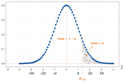 따라서, 아래와 같은 가우스 표준 정규분포를 예를 들어 생각하면, 1%의 면적을 갖는 부분을 의미한다.