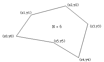 다음과 같이 주어지는 다각형에 대해서 면적, 무게 중심, 단면2차 모멘트 계산하는 공식은 다음과 같다.
